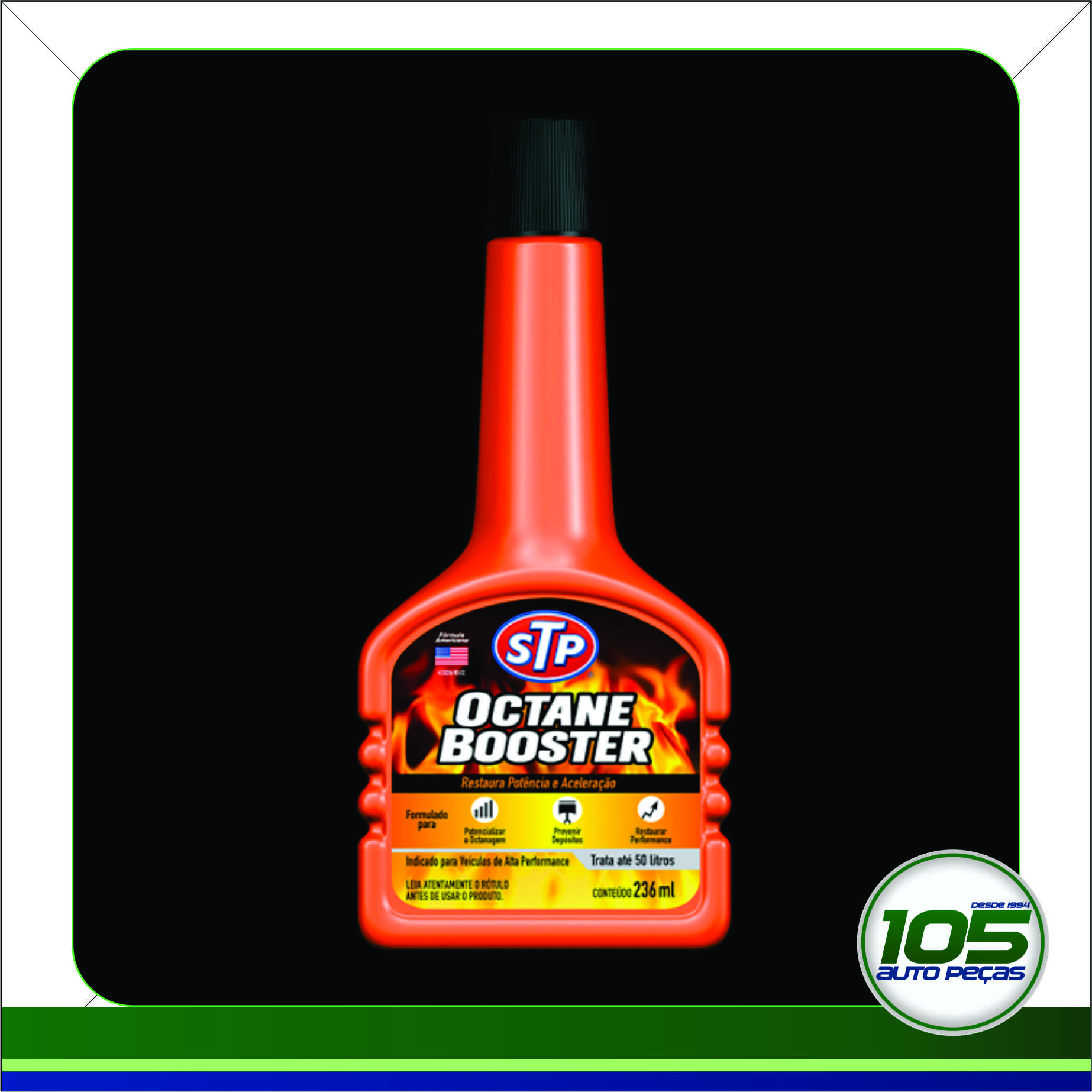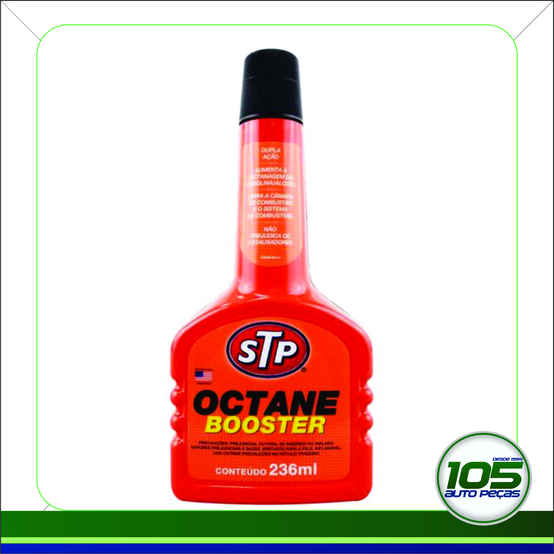O STP OCTANE BOOSTER aumenta a octanagem da gasolina, evita as “batidas do motor”, limpa a câmara de combustão e proporciona economia de combustível. Pode ser utilizado em etanol para limpeza do sistema.